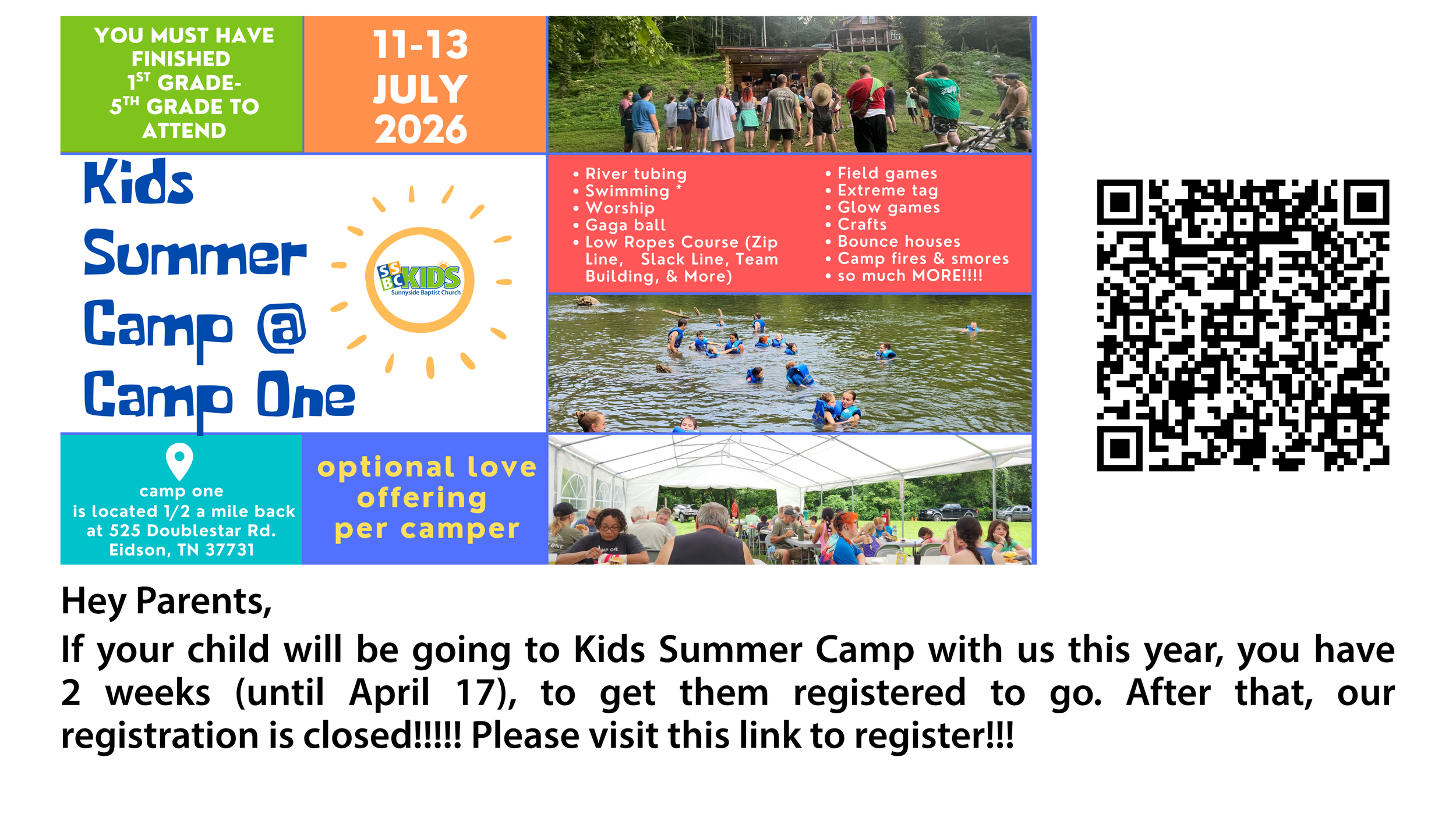July 11 - July 13 we will going to Camp One in Eidson, TN. You must have finished 1st - 5th grade to attend. We will be participating in river tubing, swimming, worship, gaga ball, low ropes course (zip line, slack line, team building, & more), field games, extreme tag, glow games, crafts, bounce houses, camp fires & smores, and so much more!!!